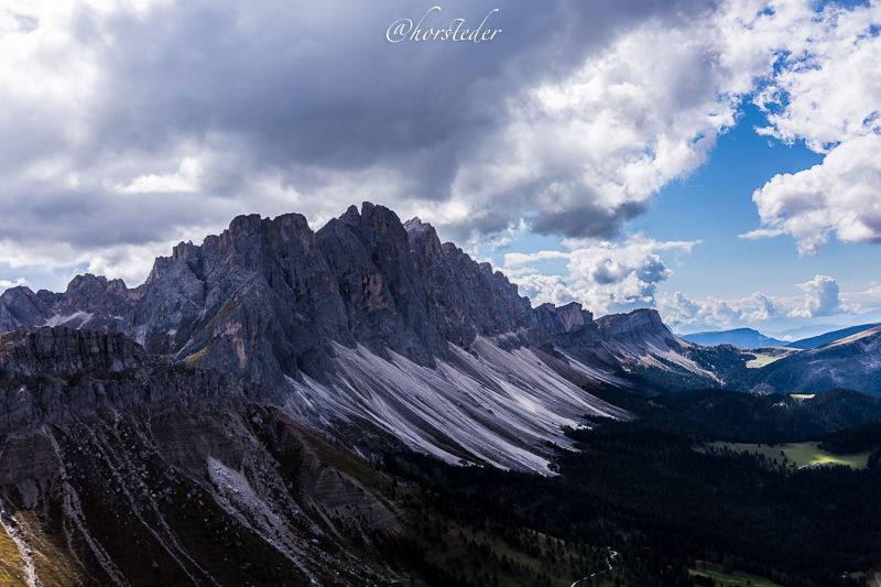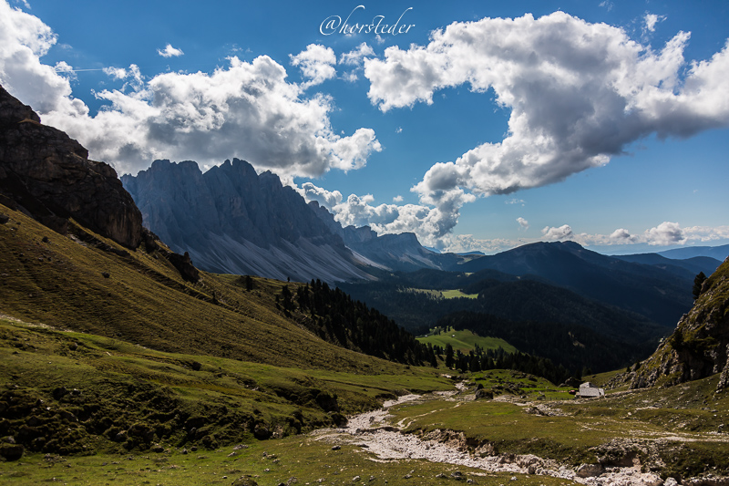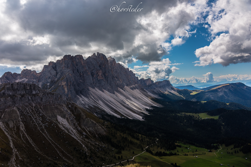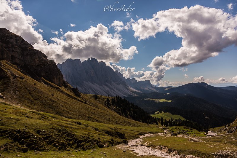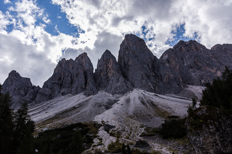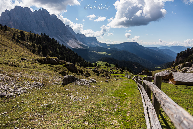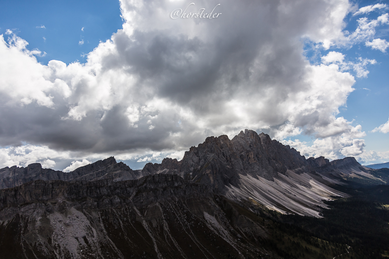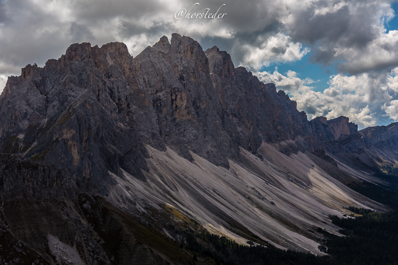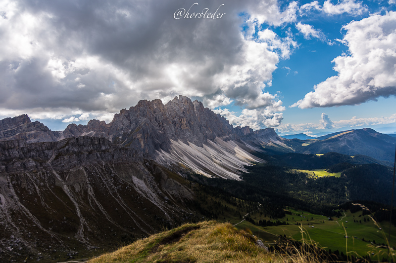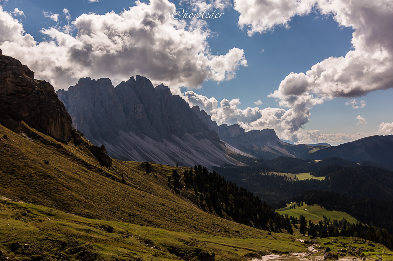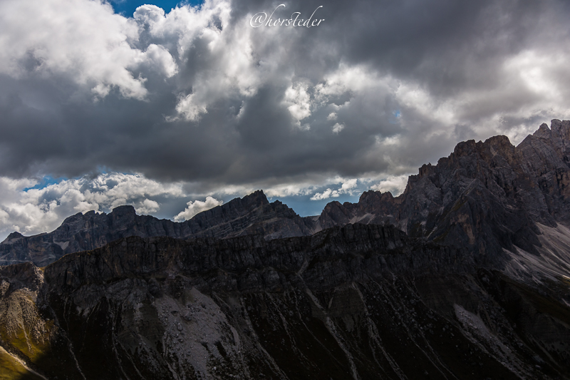 Die Geislergruppe ist eine Gebirgsgruppe der Dolomiten, die den Kamm zwischen Villnöß und Gröden in Südtirol bildet. Sie liegt zu großen Teilen im Naturpark Puez-Geisler. Als Hauptgipfel gilt der Sass Rigais im östlichen Teil des Gebirges. Ich bin entlang der Gruppe gewandert bis zur Schlüterhütte und dann zurück nach St. Magdalena. Eine sehr lange, aber auch eine sehr lohnende Tour!