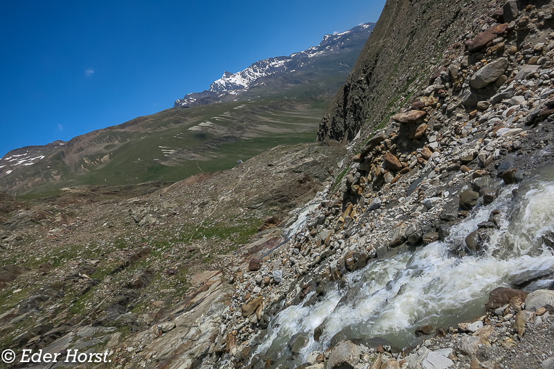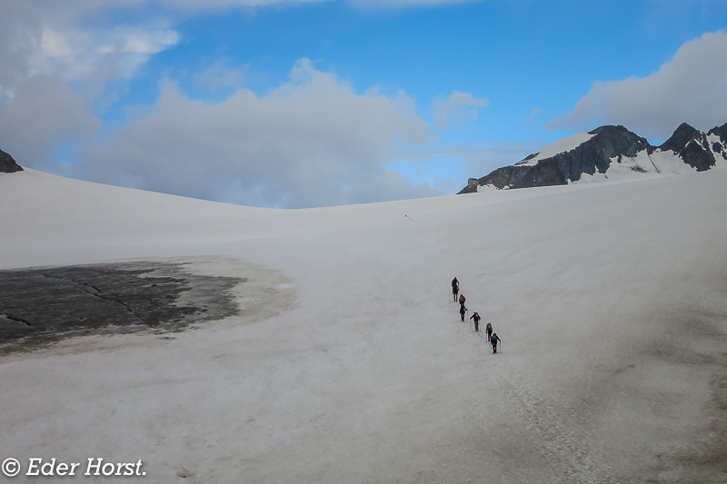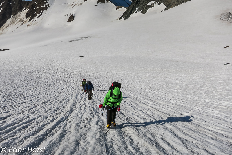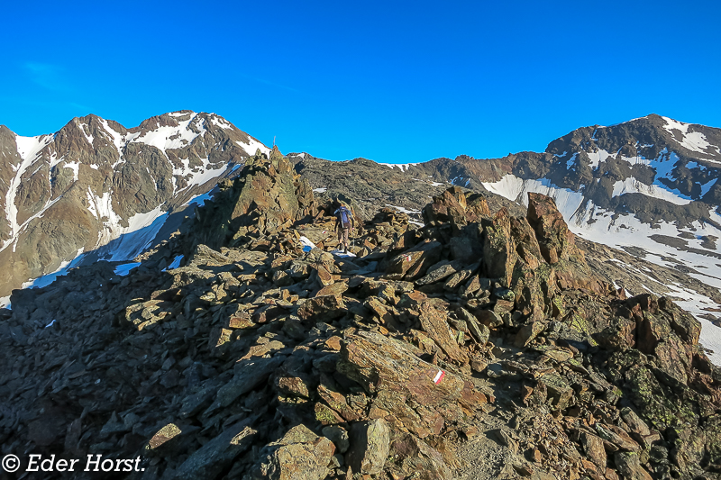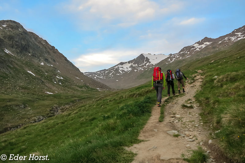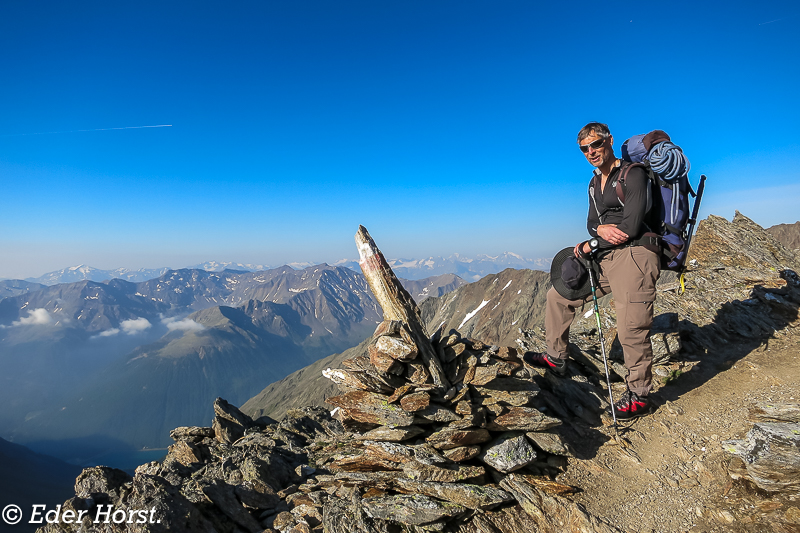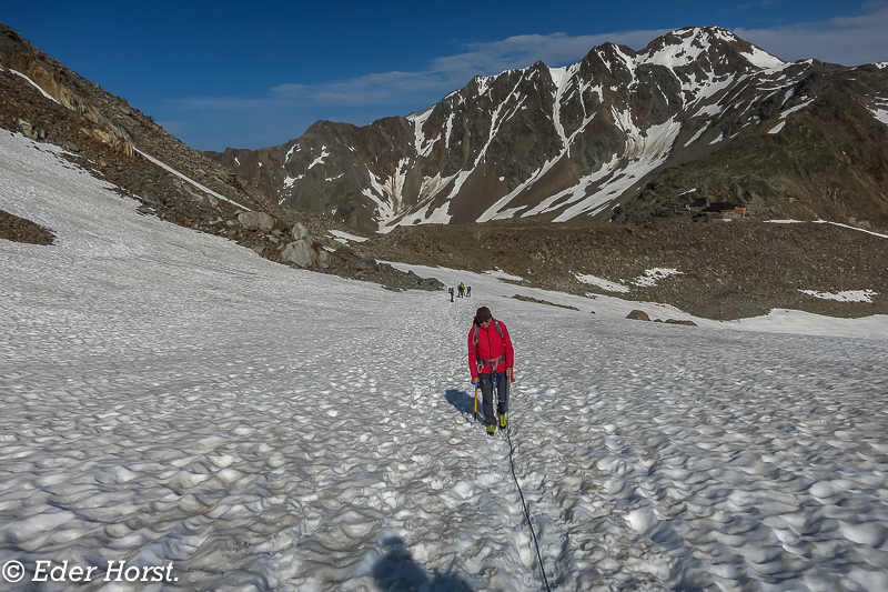 Für eine Woche machten wir uns auf den Weg, das Ötztal zu durchwandern. Gestartet sind wir in Vent. Die Martin-Busch-Hütte, Similaunhütte, das Hochjochhospiz, die Brandenburger Haus und die Vernagthütte waren unsere jeweiligen Etappenziele. Von den Hütten aus starteten wir dann zu den einzelnen Gipfeln. Das Wetter meinte es sehr gut mit uns: eine Woche Sonnenschein und perfekte Bedingungen. Für mich ist es eines der schönsten Gebiete, in denen man Hochtouren unternehmen kann.