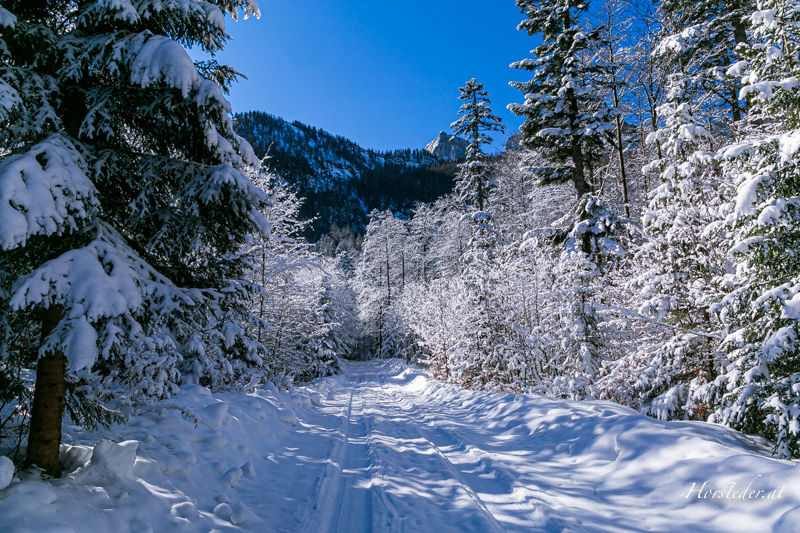 Eine schöne Tour: Zuerst geht es entlang des Schwarzensees und dann hinauf zur Eisenauer Alm am Fuße des Schafbergs. Es ist eine herrliche Wanderung in einer wundervollen Gegend – und das mitten im Winter. Ich war alleine unterwegs, und bei Temperaturen von -10 °C war die Tour eine echte Herausforderung. Insgesamt sind ca. 20 Kilometer am Stück zu gehen, was man bei dieser Kälte nicht unterschätzen sollte.